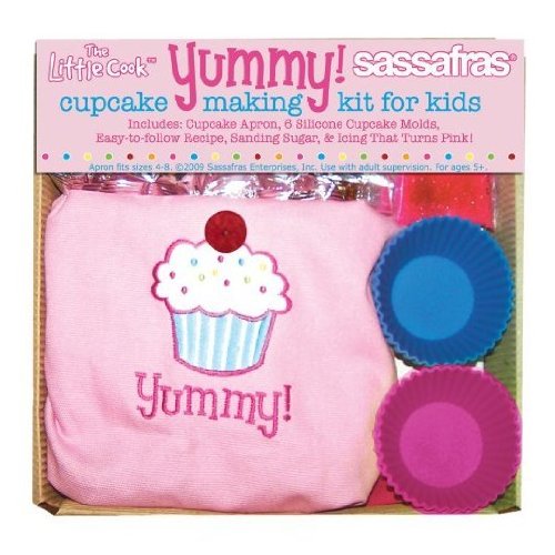 Get ready for loads of kitchen capers with this fun cupcake making kit for girls. Put on the apron, grab your tools, and get baking! Gift boxed set comes complete with embroidered apron, 6 non-stick silicone cupcake molds, sanding sugar, icing mix that turns pink and recipe. Apron is made from an easy-care, machine washable 100% cotton and features embroidered "yummy!" cupcake motif with felt applique cherry accent. Apron measures 23" long x 18" wide (excluding straps) and fits children ages 4 through 8 years.